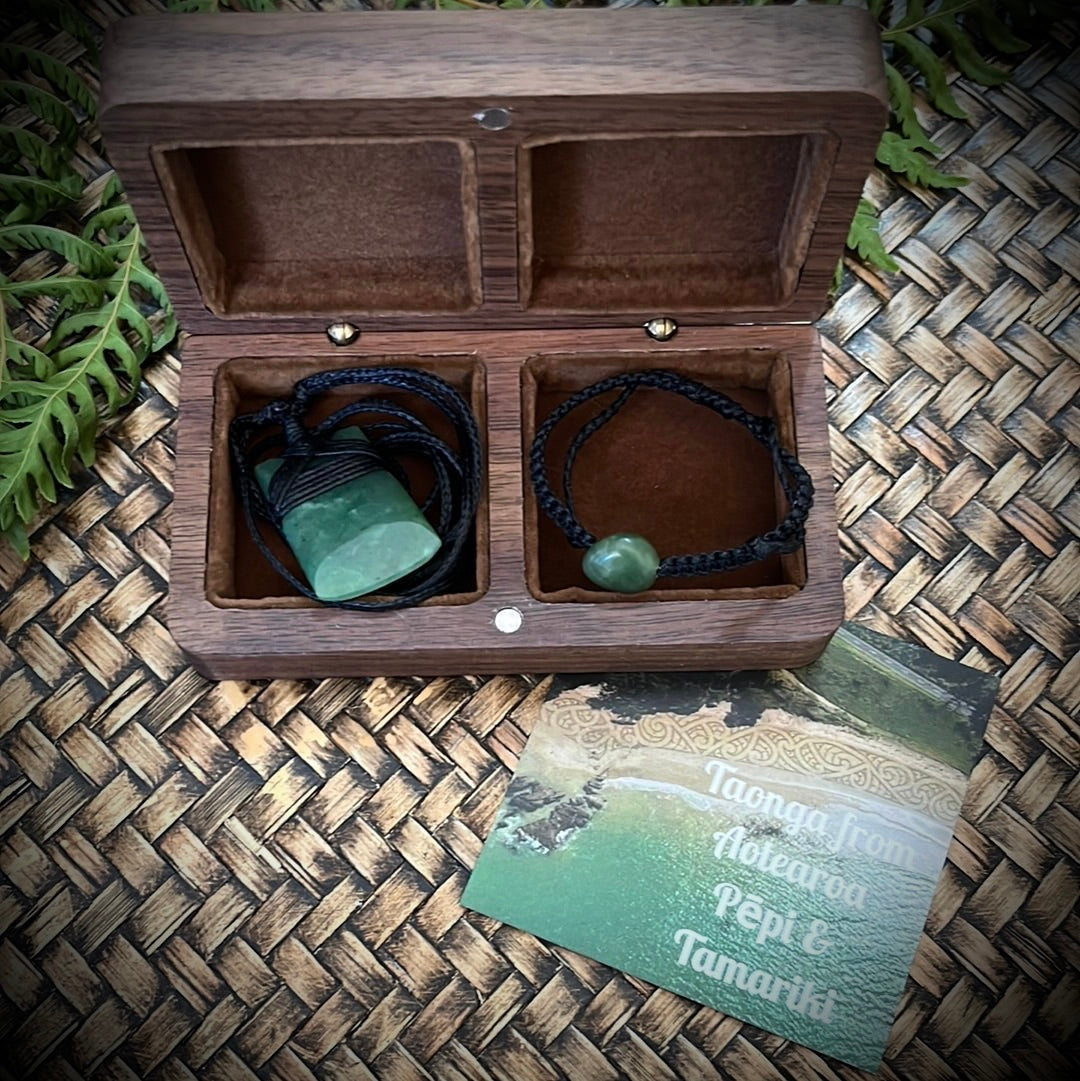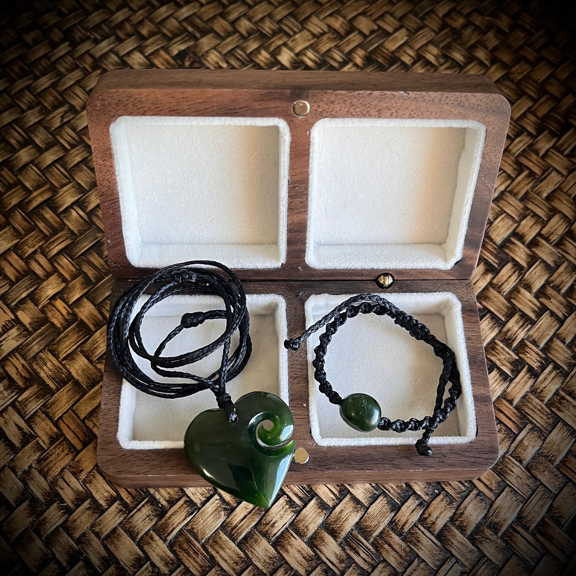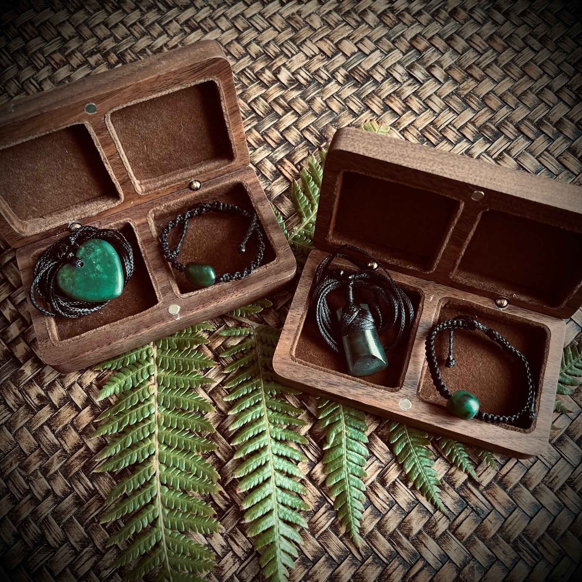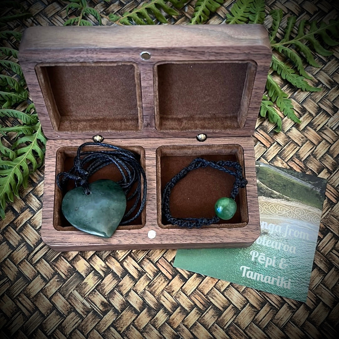 The Pepi~koha~gift pack includes a Greenstone bracelet and pendant, perfect for children aged 0-5 years old. The bracelet can fit most children up to 5 years old and the pendant comes in either the Pēpi Toki (3cm) design or the greenstone (3.0cm) Heart design. The set also comes in a beautiful wooden trinket gift box.