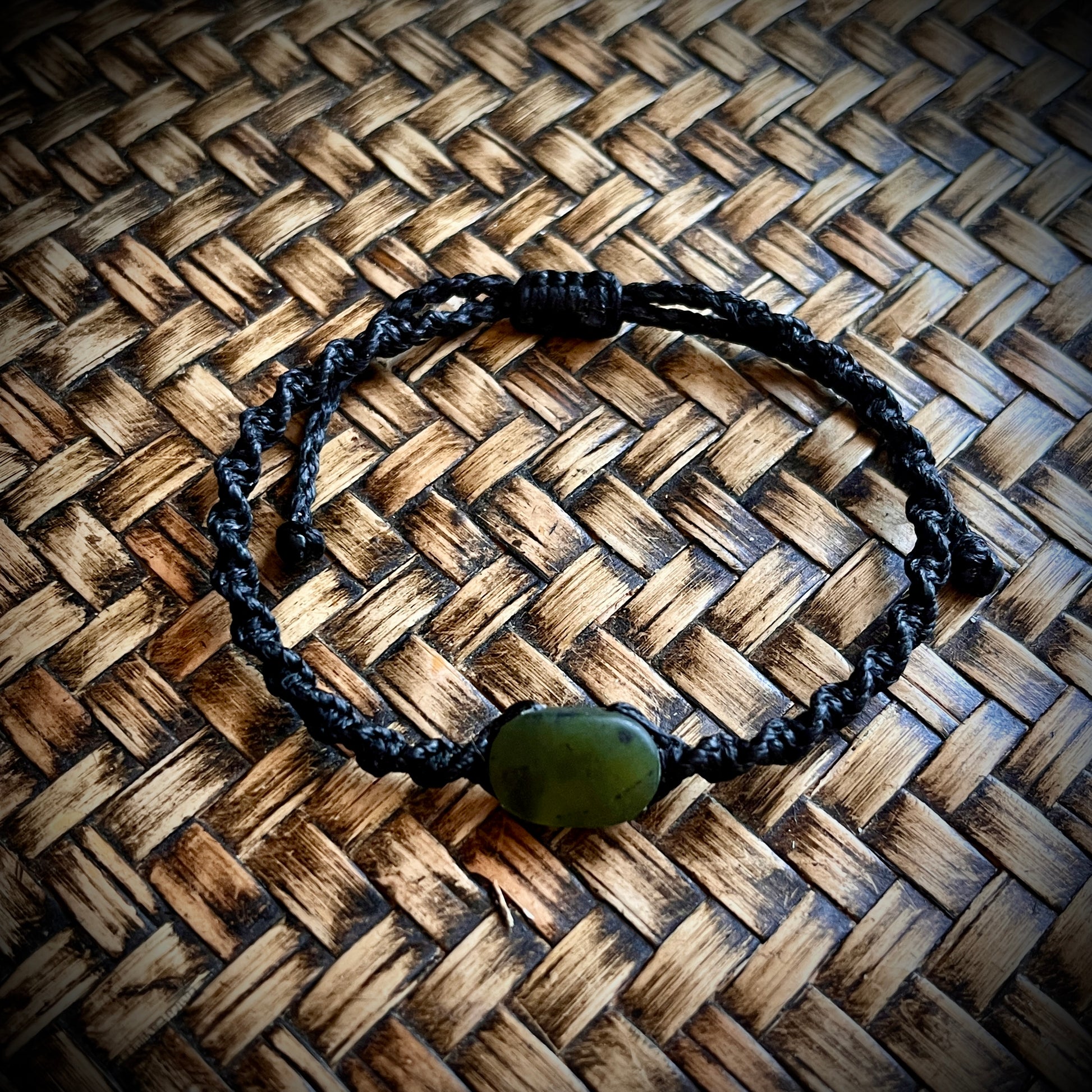 Bracelet: The bracelet features a small 1.5 cm Pounamu stone, nestled in a simple, braided cord. The stone's deep green color, flecked with hints of darker hues, brings to mind the lush forests and flowing rivers of New Zealand. The design is minimalist, yet the stone's natural beauty shines through, offering a quiet, earthy elegance.