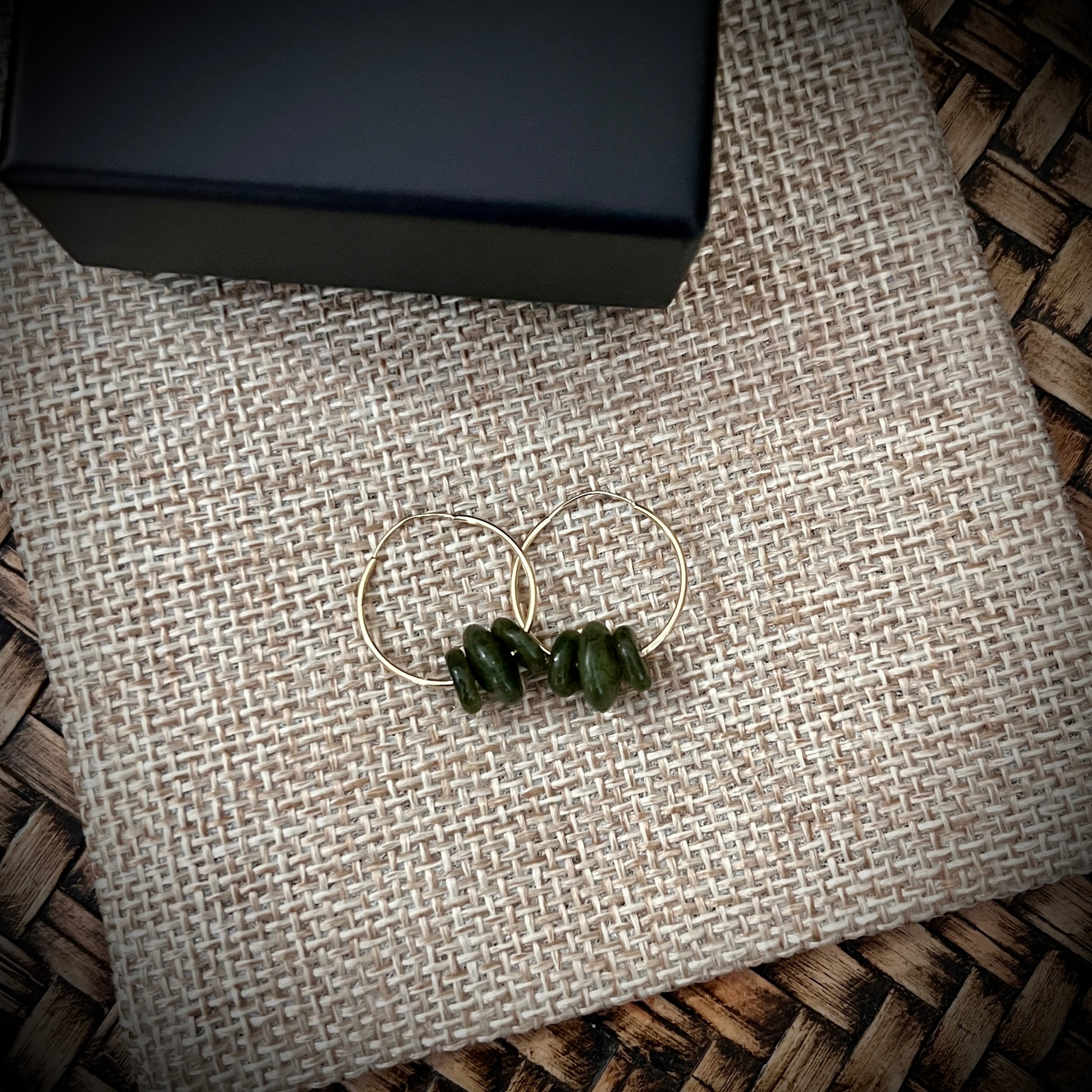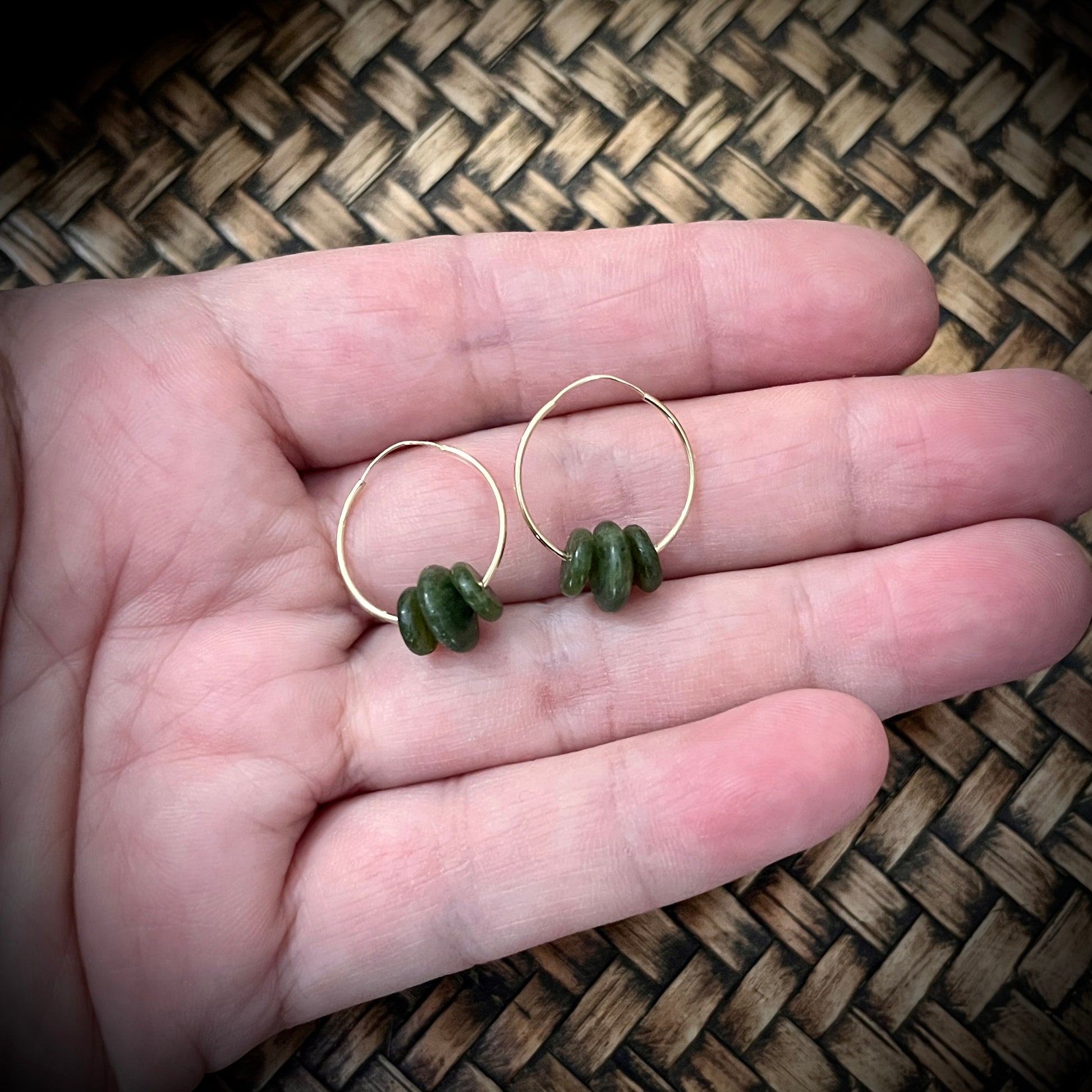 This is a single 15mm lightweight sleeper earring made from 9ct gold, featuring three small greenstone discs. It’s simple, stylish, and super easy to wear—great for everyday use or adding a subtle touch of colour. The greenstone has a lovely earthy tone that pairs beautifully with the gold. A unique little piece with a natural feel.